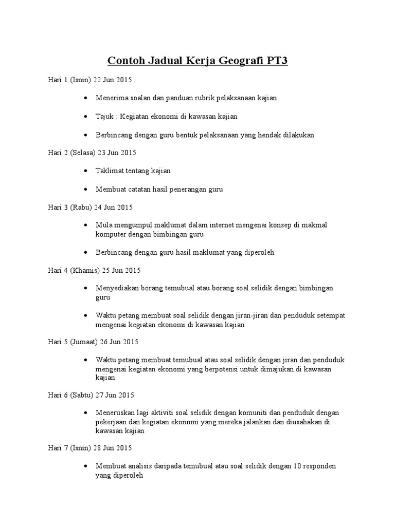 Pelajar wajib membuat kajian dan menghasilkan laporan yang panjangnya tidak kurang daripada 300 patah perkataan berdasarkan petikan yang diberi iaitu Dokumen. B Perancangan merangkumi. Contoh Jadual Kerja Geografi PT3 2022 Lapangan Tingkatan 3.